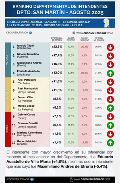 Según la última encuesta de CB Consultora correspondiente a agosto 2025, el intendente de Villa Nueva, Ignacio Tagni, encabeza el ranking departamental de imagen en San Martín con un diferencial positivo de +22,3%, ubicándose como el dirigente mejor valorado de la región.